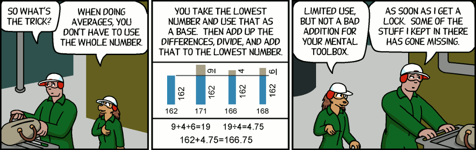 Florence: You take the lowest number and use that as a base. Then add up the differences, divide, and add that to the lowest number.