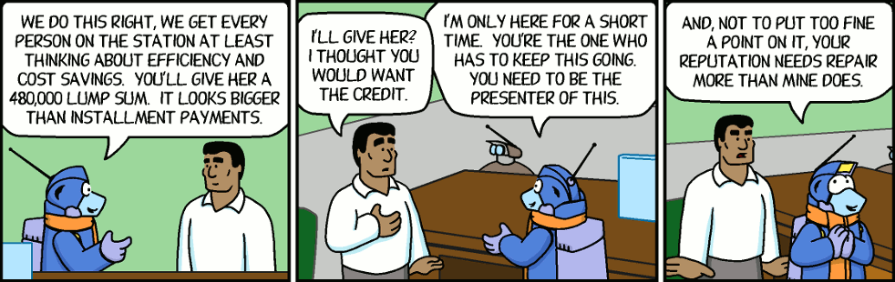 Sam: We do this right, we get every person on the station at least thinking about efficiency and cost savings. You'll give her a 480,000 lump sum. It looks bigger than installment payments.