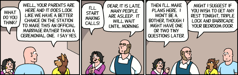 Florence: Well, your parents are here and it does look like we have a better chance on the station to make this an official marriage rather than a ceremonial one. I say yes.