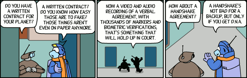 Sam: A written contract? Do you know how easy those are to fake? Those things aren't even on paper anymore.