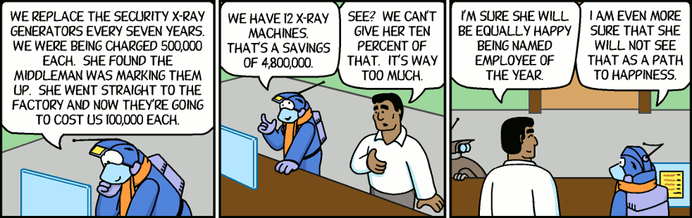 Sam: We replace the security x-ray generators every seven years. We were being charged 500,000 each. She found the middleman was marking them up. She went straight to the factory and now they're going to cost us 100,000 each.