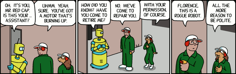 Robot: Oh. It's you, Mr. Red Cap. Is this your ... assistant?