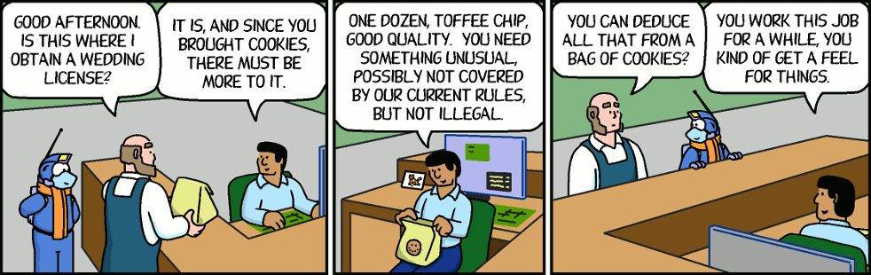 Secretary: One dozen, toffee chip, good quality. You need something unusual, possibly not covered by our current rules, but not illegal.