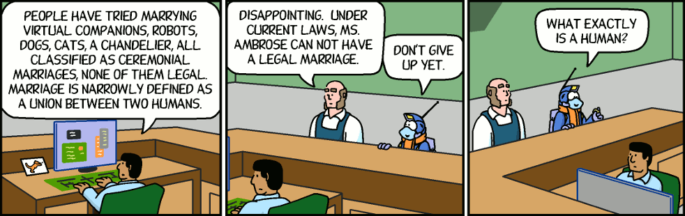 Secretary: People have tried marrying virtual companions, robots, dogs, cats, a chandelier, all classified as ceremonial marriages, none of them legal. Marriage is narrowly defined as a union between two humans.