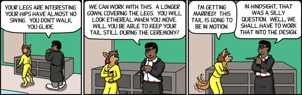 Edith: We can work with this. A longer gown, covering the legs. You will look ethereal when you move. Will you be able to keep your tail still during the ceremony?