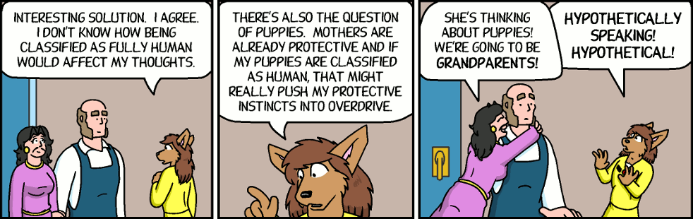 Florence: There's also the question of puppies. Mothers are already protective and if my puppies are classified as human, that might really push my protective instincts into overdrive.