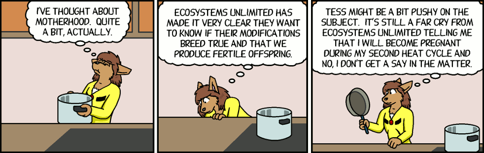 Florence (thinking): Tess might be a bit pushy on the subject. It's still a far cry from Ecosystems Unlimited telling me that I will become pregnant during my second heat cycle and no, I don't get a say in the matter.